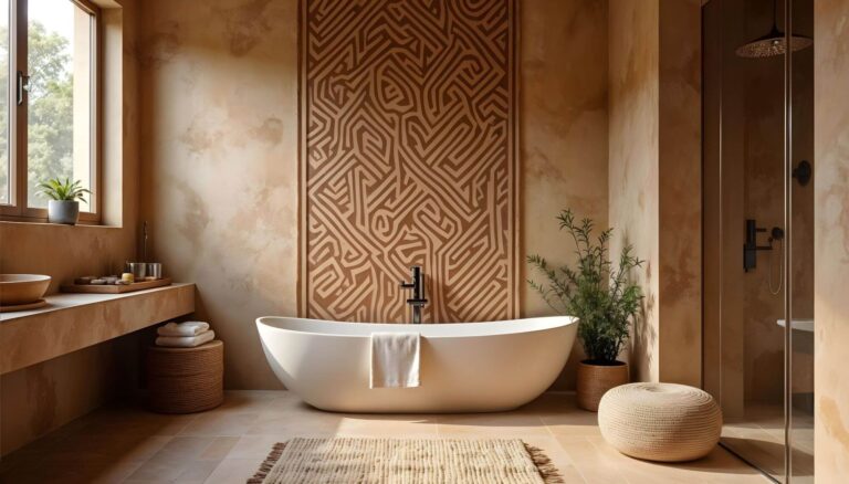 Ready to level up? Let’s talk pattern walls. This is where African decor for bathroom design gets seriously exciting.