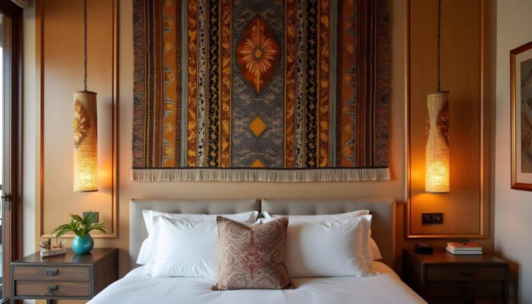 A fabric wall hanging above the bed changes everything. It brings in warmth and a soft, relaxed vibe that works beautifully in bedrooms. You can go minimal with a neutral weave or get playful with texture and color. Compared to a hard-edged frame, it adds a layer of softness that makes the room feel inviting.