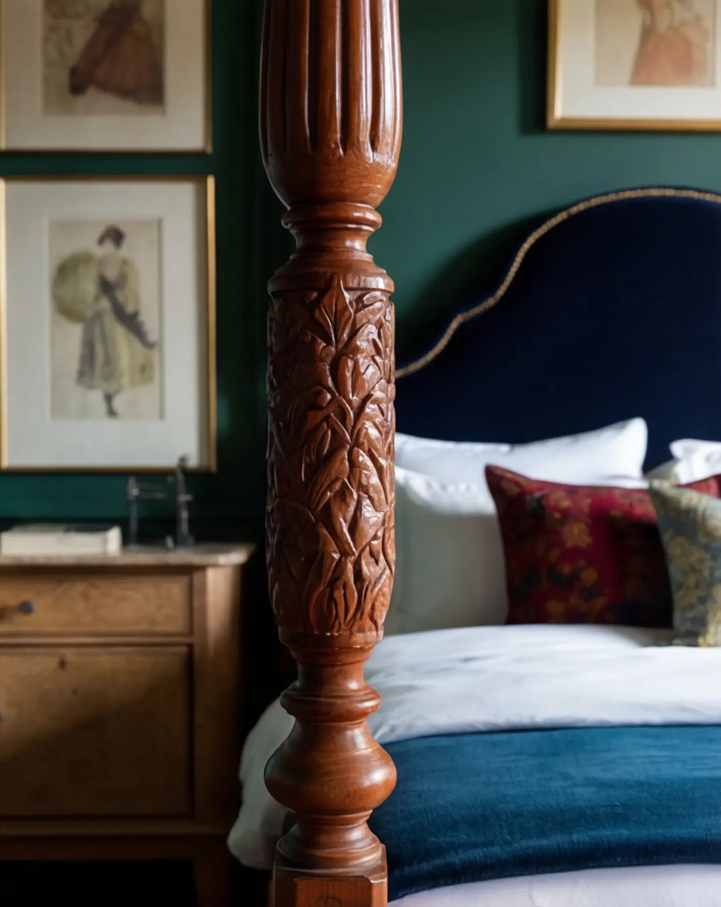 Furniture with presence: Curved sofas in saturated tones. Four-poster beds. Tufted benches. Mid-century credenzas. Sculptural coffee tables. Vintage finds with character.