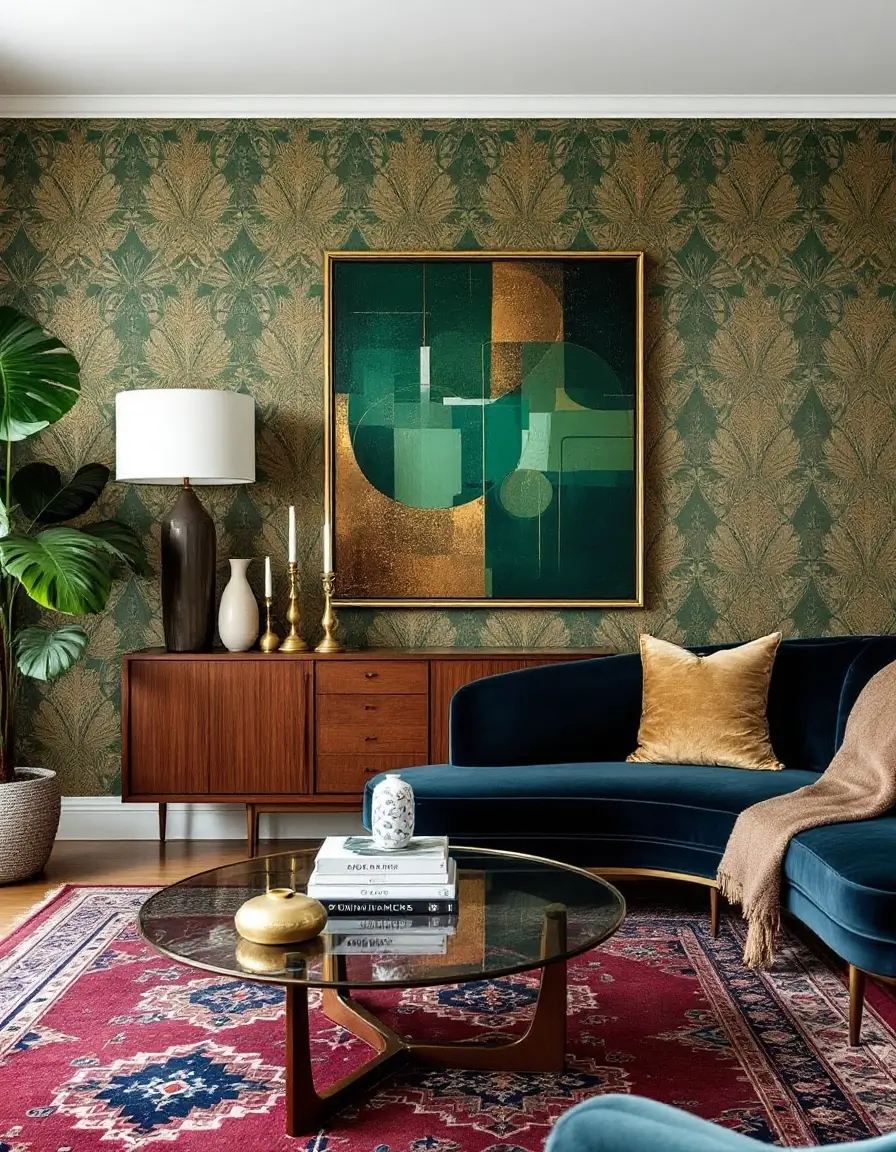 Geometric wallpapers set the stage. Curved velvet sofas in jewel tones are the statement. Vintage rugs layer a dream underfoot. Every brass accent catches the light just right. These are rooms designed for living in—for long conversations and evening cocktails.
